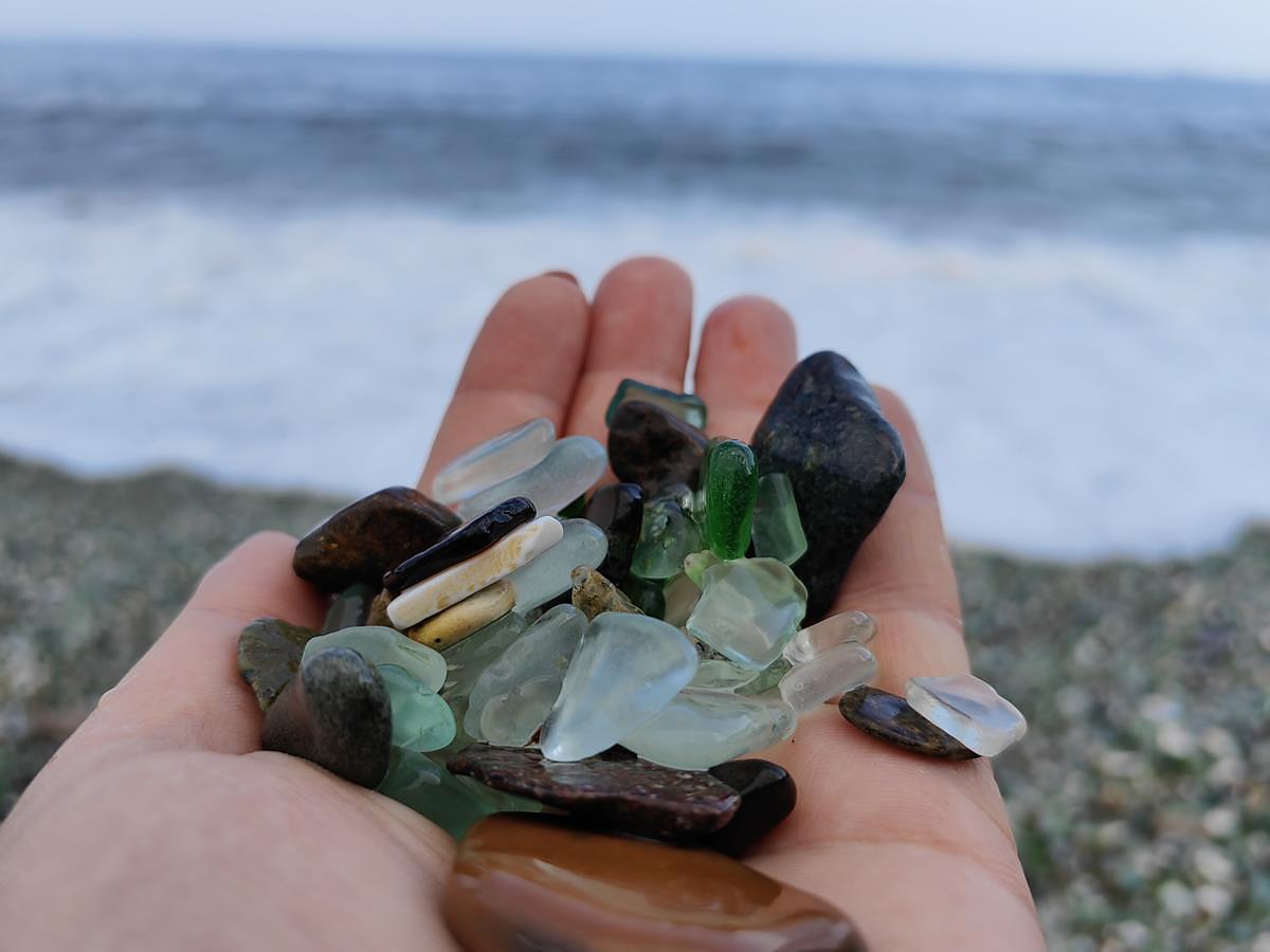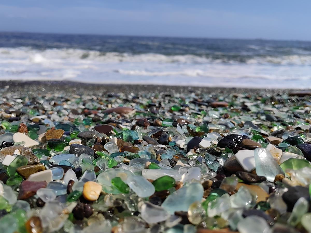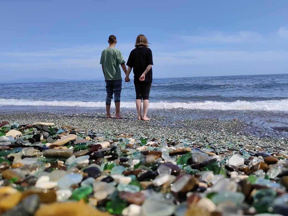 Уникальное место – бухта Стеклянная во Владивостоке. Уникальность бухты, в том, что она усыпана кусочками битого стекла, по сути, это стеклянный пляж, на котором вперемешку песок, стекло и галька. К сожалению, уникальность этой бухты — это результат загрязнения природы человеком, т.к. когда-то эти красивые стекляшки были обычными бутылками. Пляж в бухте Стеклянной не единственный, в мире таких пляжей всего два, второй находится в Форт-Брэгг штат Калифорния США. История образования пляжа в США такая же, как и во Владивостоке, когда-то на месте пляжа была свалка и после ее закрытия осталось куча битого стекла. Стеклянная бухта довольно уютное место, которое закрыто с двух сторон скалами, на самом пляже песок необычного темного цвета, а ближе к воде песок с галькой и стеклом. По пляжу можно не опасаясь ходить босиком, т.к. битое стекло море своими волнами отшлифовало и получился красивый необычный пляж. По обе стороны пляжа Стекляшки расположены красивые скалы, причем с левой стороны пляжа открывается вид на сползающие скалы, которые под наклоном уходят в море.