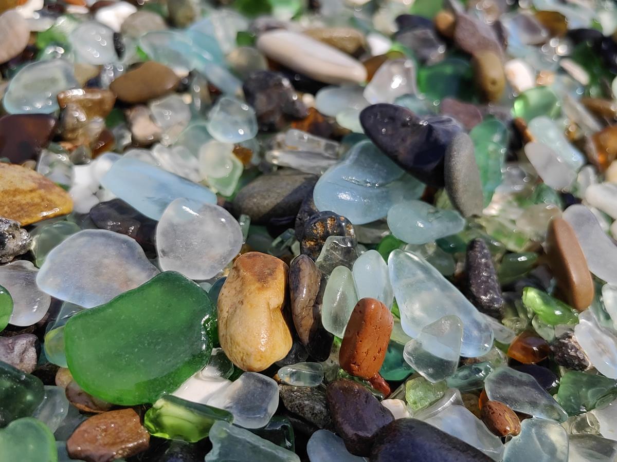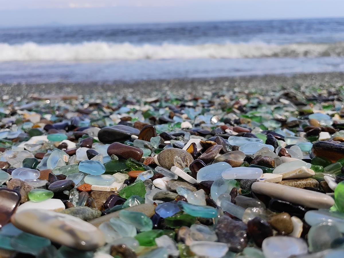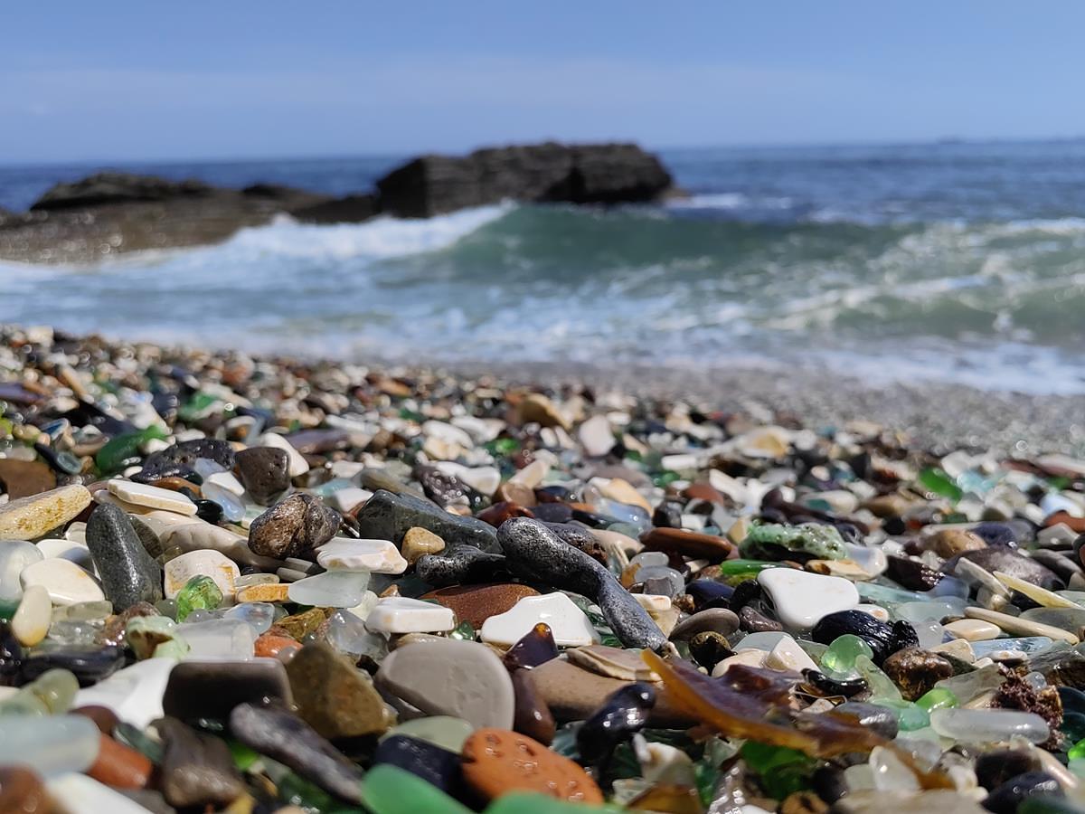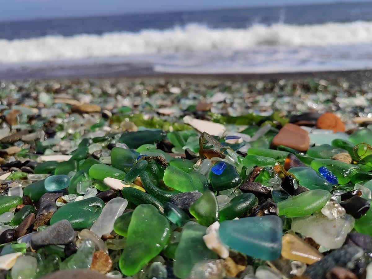 Уникальное место – бухта Стеклянная во Владивостоке. Уникальность бухты, в том, что она усыпана кусочками битого стекла, по сути, это стеклянный пляж, на котором вперемешку песок, стекло и галька. К сожалению, уникальность этой бухты — это результат загрязнения природы человеком, т.к. когда-то эти красивые стекляшки были обычными бутылками. Пляж в бухте Стеклянной не единственный, в мире таких пляжей всего два, второй находится в Форт-Брэгг штат Калифорния США. История образования пляжа в США такая же, как и во Владивостоке, когда-то на месте пляжа была свалка и после ее закрытия осталось куча битого стекла. Стеклянная бухта довольно уютное место, которое закрыто с двух сторон скалами, на самом пляже песок необычного темного цвета, а ближе к воде песок с галькой и стеклом. По пляжу можно не опасаясь ходить босиком, т.к. битое стекло море своими волнами отшлифовало и получился красивый необычный пляж. По обе стороны пляжа Стекляшки расположены красивые скалы, причем с левой стороны пляжа открывается вид на сползающие скалы, которые под наклоном уходят в море.