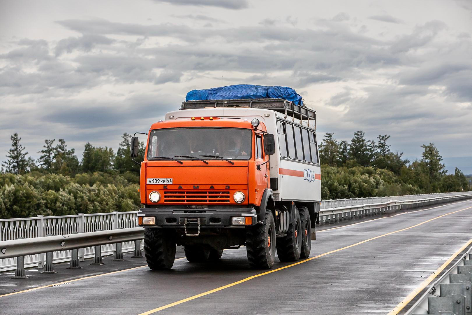 Погрузка в машину (пассажирская «вахтовка» КАМАЗ) и выезд в район Ключевской группы вулканов (около 500 км).