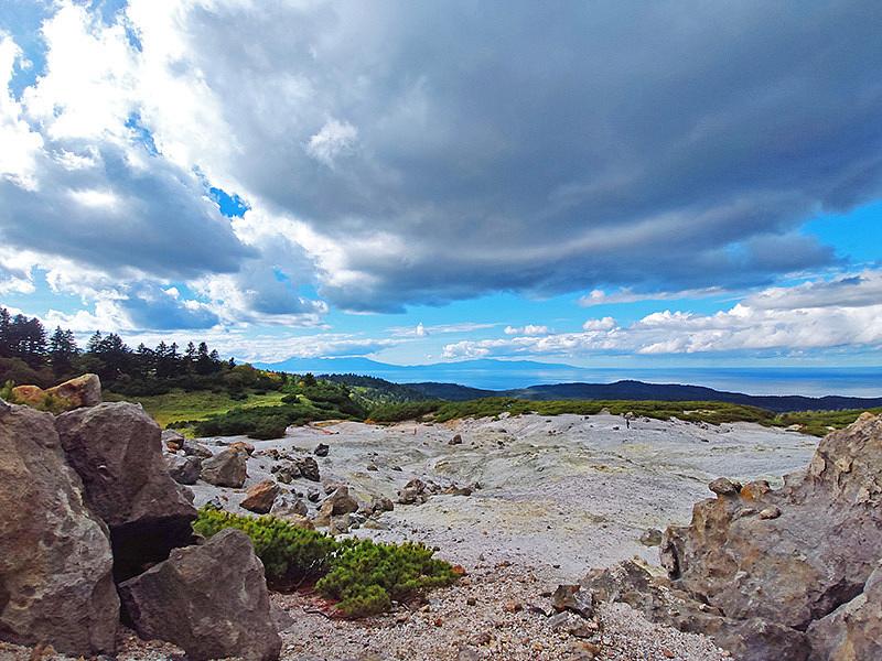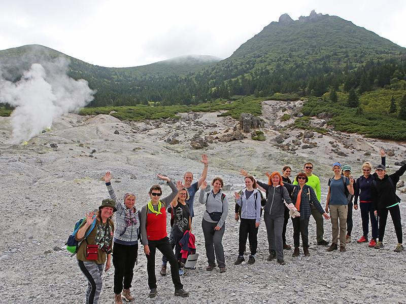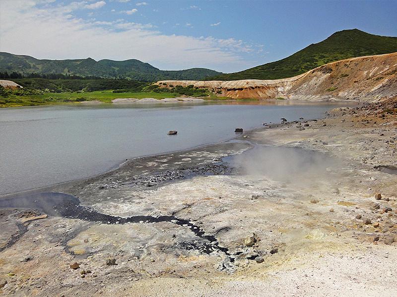 10:00 Отправление на маршрут средней сложности «Вулкан Головнина. Озера Кипящее и Горячее». На машинах 40 мин, далее треккинг 2.5 - 3 часа по тропинке, 7 км в одну сторону. Весь путь сопровождают красивейшие поля кедрового стланика и курильского бамбучника, совершенно непроходимые для человека. Вулкан представляет собой кальдеру в диаметре порядка 4 км, окруженную гребнем с макс. высотой 541 м. На дне кальдеры четыре небольших купола и два кратера - озера Кипящее и Горячее. Время стоянки в кальдере ~3 часа. Обед (сухпаек).