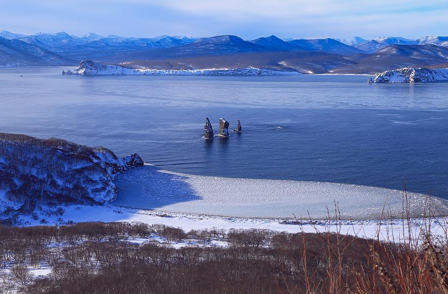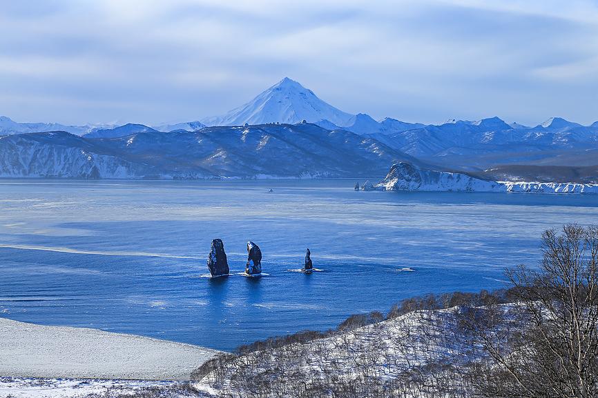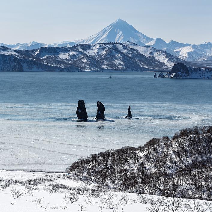 • Прибытие на смотровую площадку (мыс Маячный). Обзор панорамы Авачинской бухты и Тихого океана, скалы «Три Брата», остров Старичков, а также вулканы Вилючинский и Мутновский. Фото - видеосъемка.