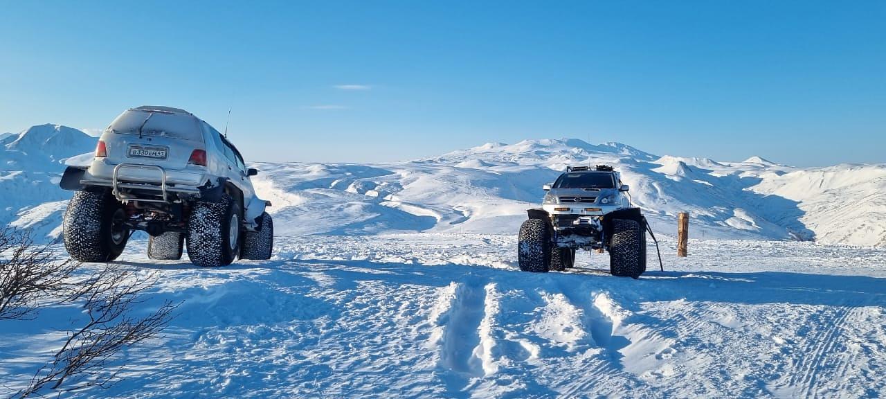 08:00-09:30 ̶ Поездка на вездеходах в район Мутновского вулкана. Остановка на смотровой площадке Вилючинского перевала