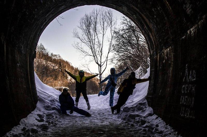 Путь проляжет по заснеженному лесу. Минуем заброшенную железную дорогу и японские туннели времен Карафуто.