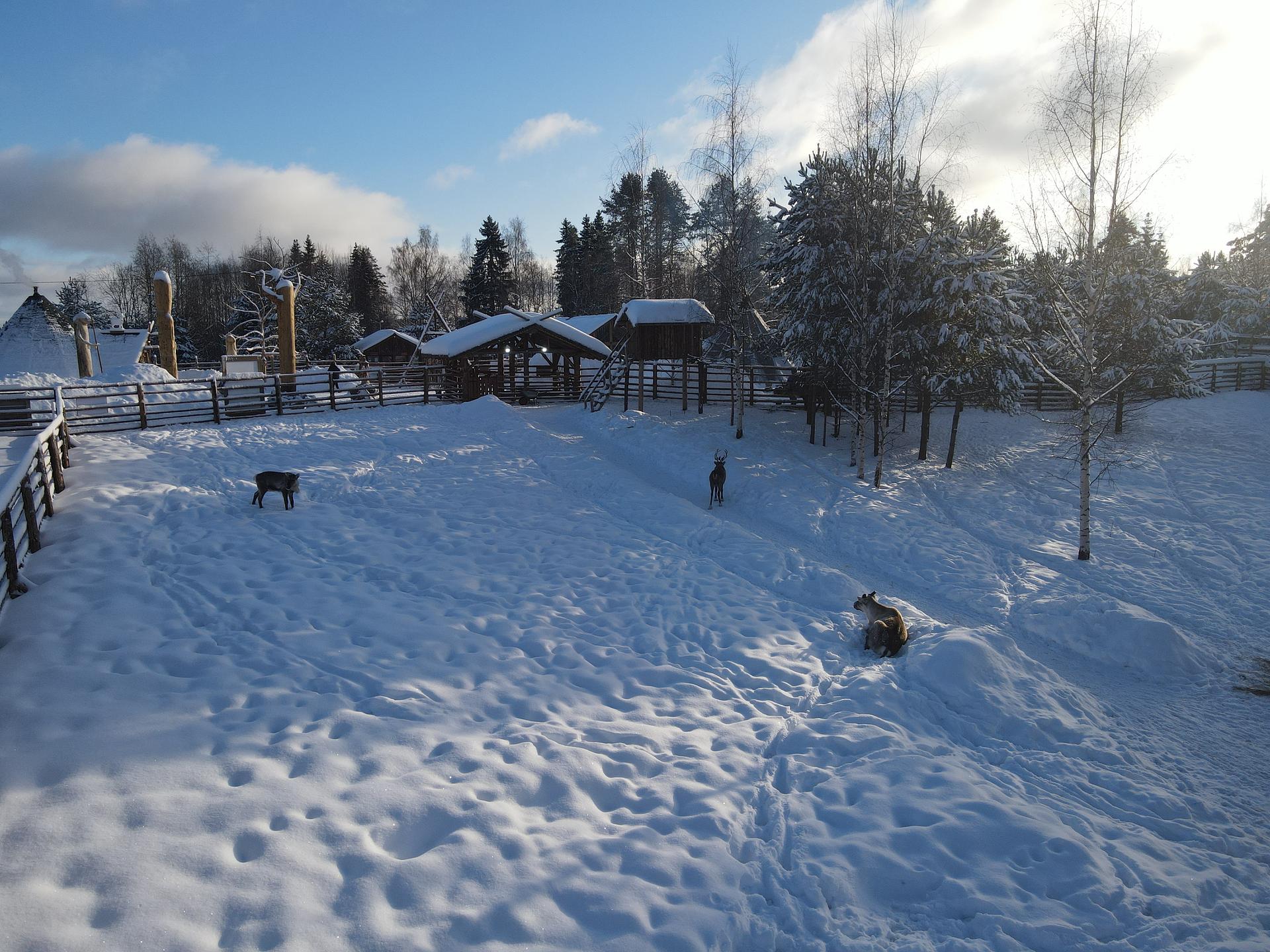 Возможность прогуляться по экотропе на 1 км, общение с оленями, хаски и лосями.