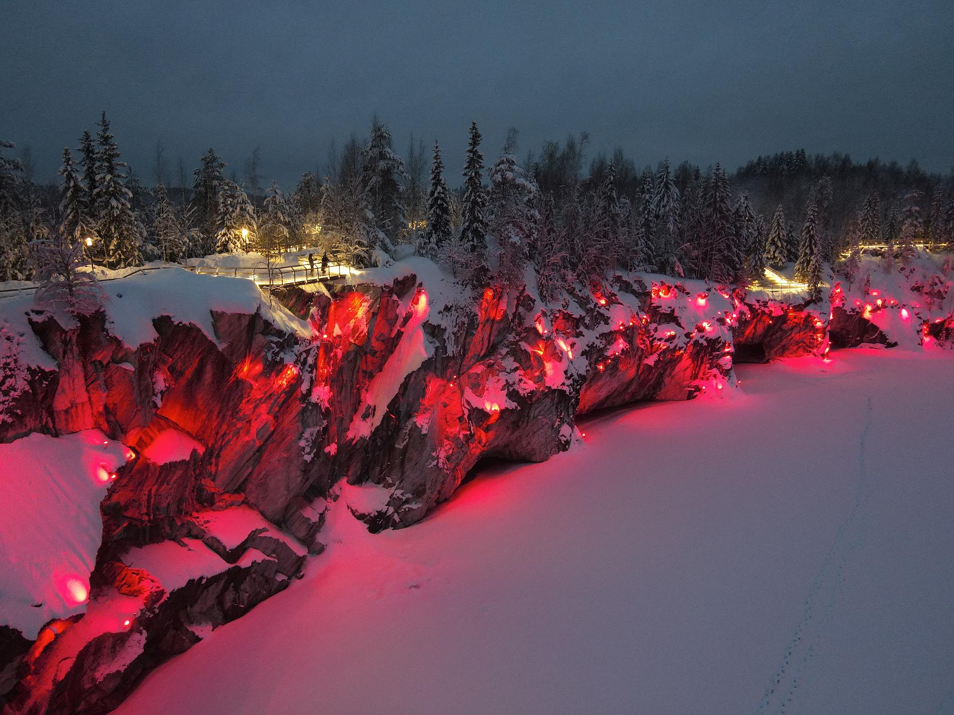 Рускеала в огнях: вечерняя подсветка в горном парке