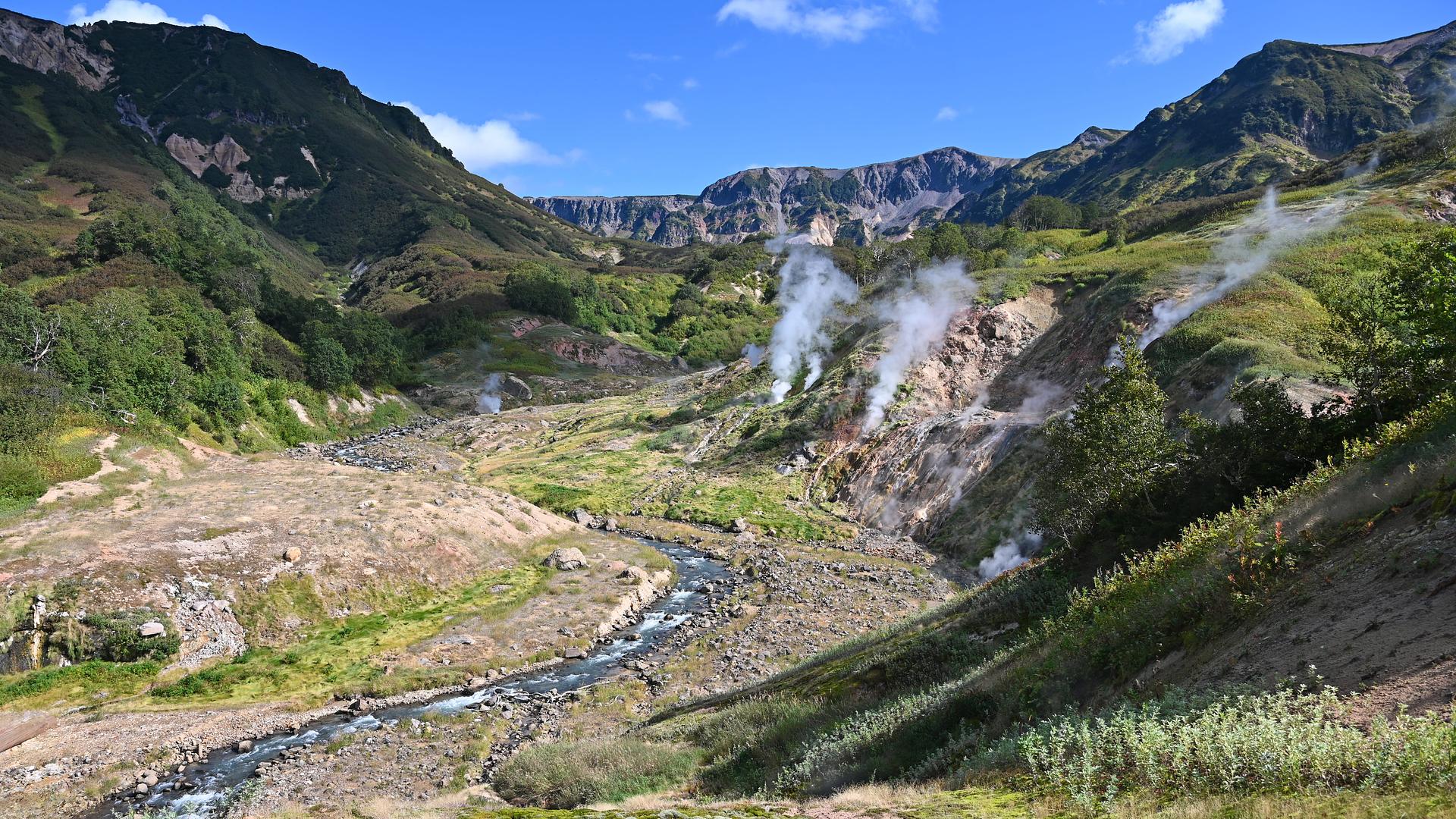Живописная долина реки Налычева окружена действующими и потухшими вулканами