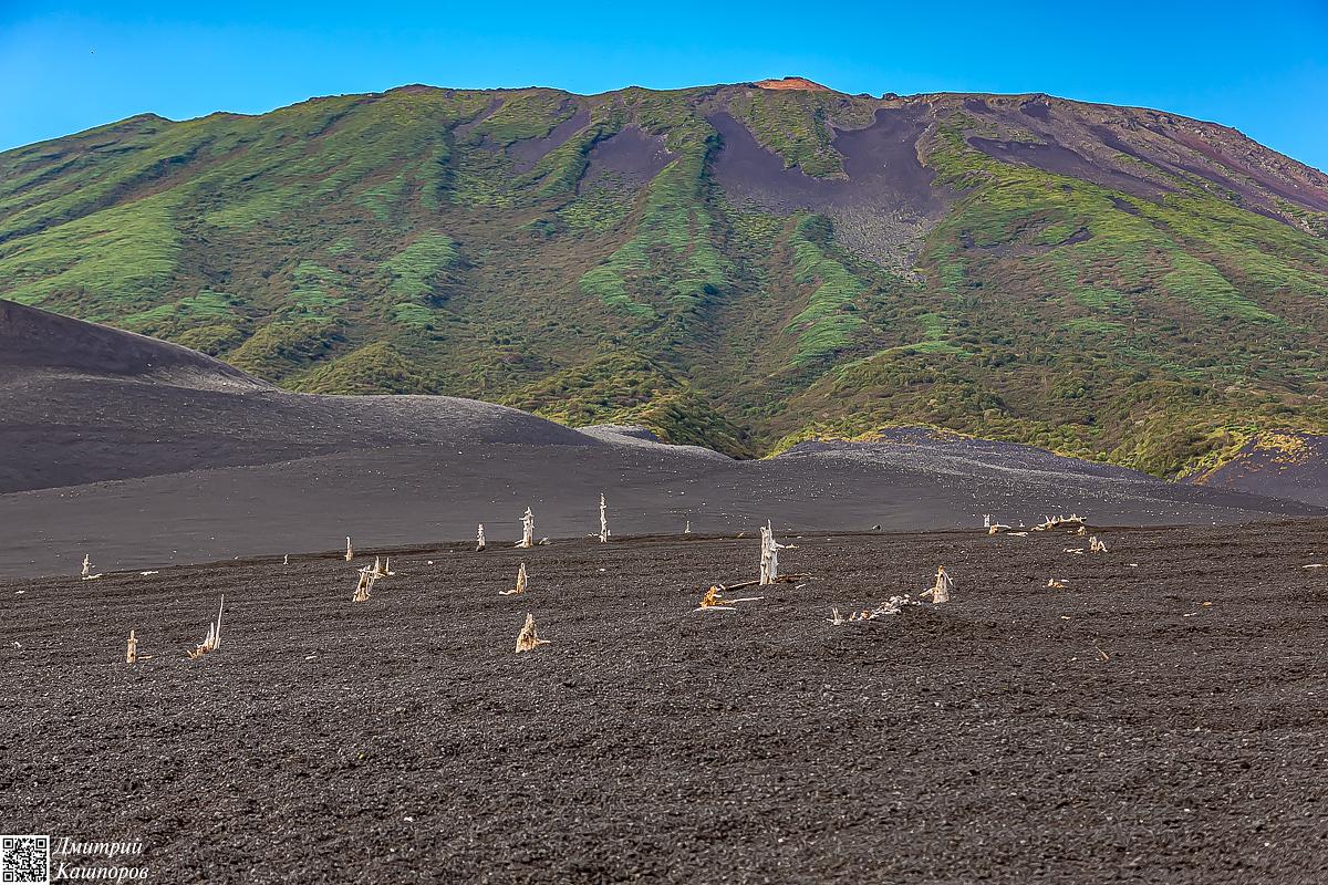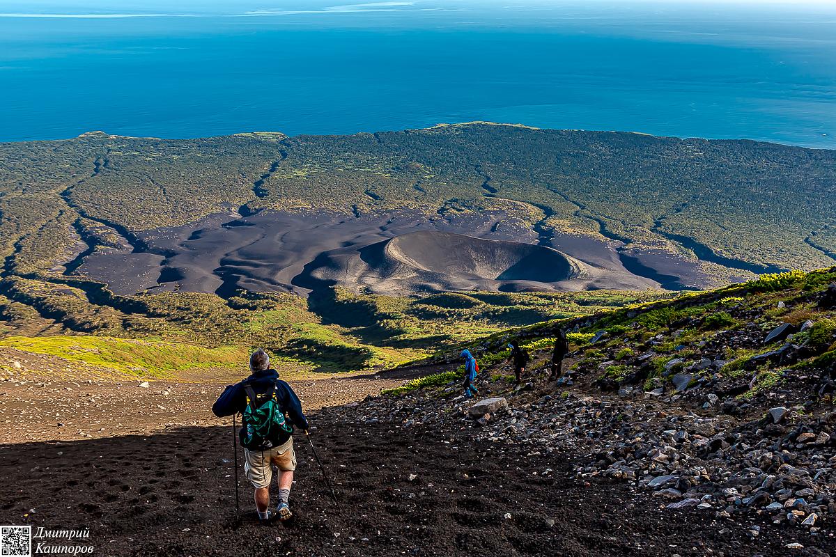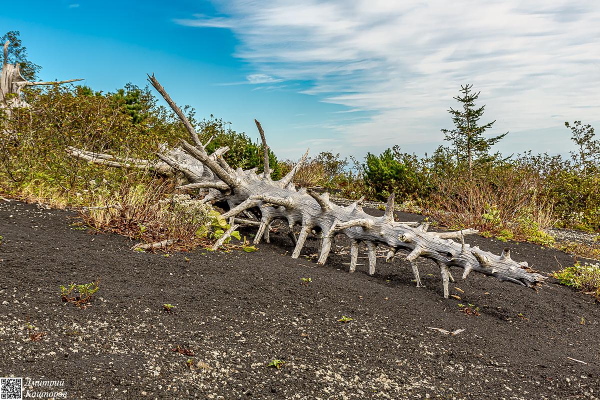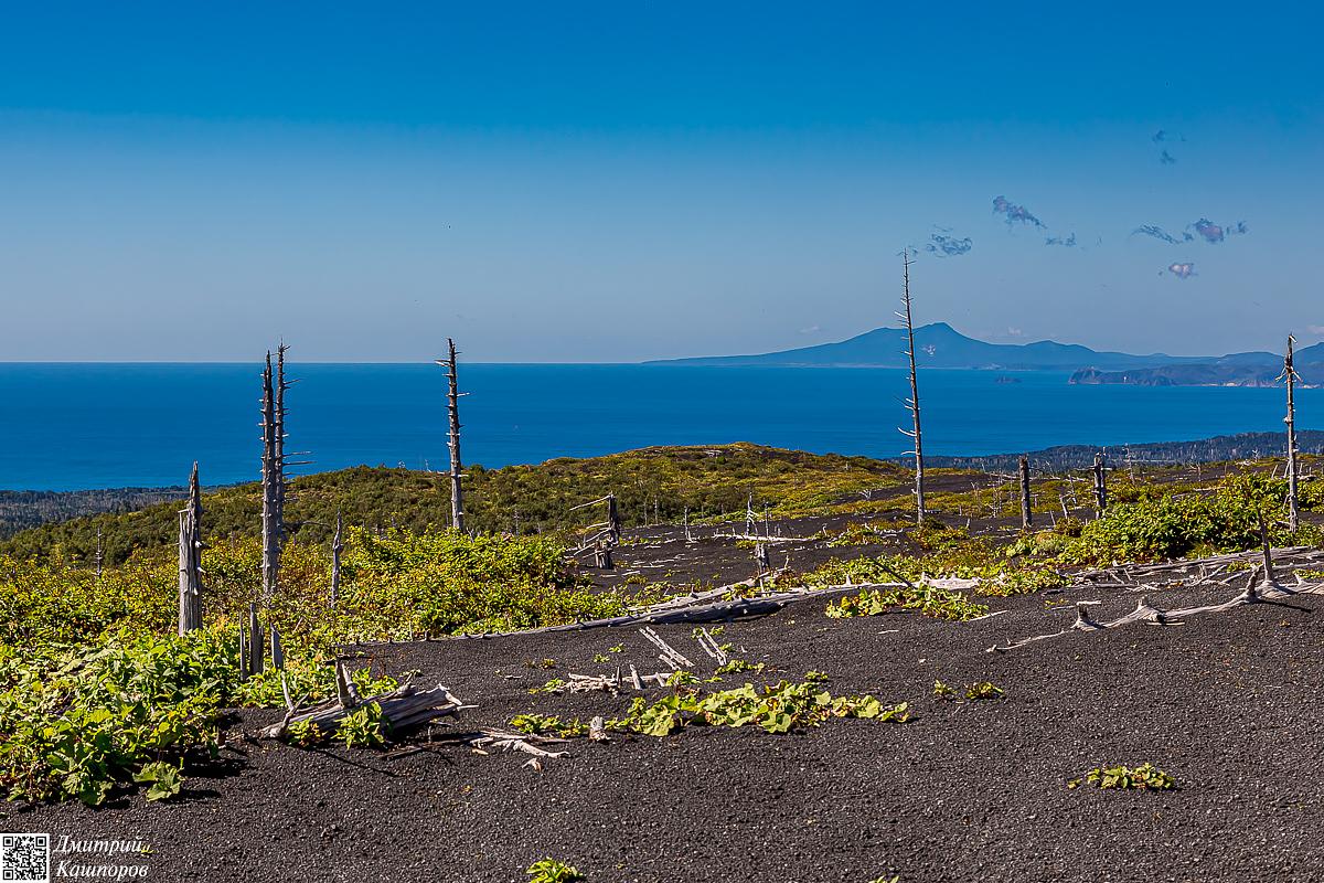 Утро третьего дня экспедиции к вулкану мы встретим с видом на Шикотан и Итуруп. После завтрака собираем палатки и начинаем спуск к побережью. Обратный путь к океану позволит еще раз спокойно рассмотреть «мертвый лес» и участки со шлаковыми полями, мимо которых мы проходили в первый день.