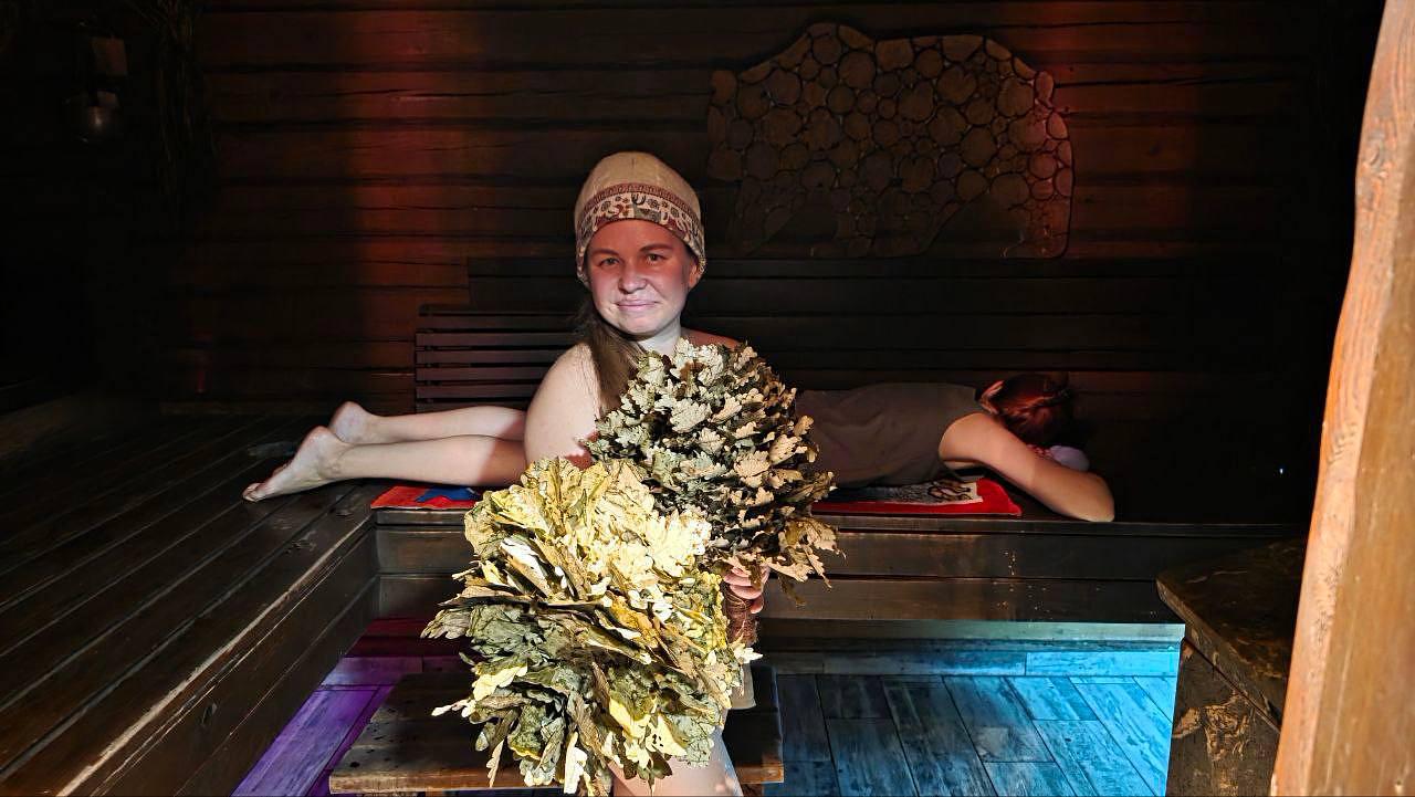 Вас ждет: парение ароматными вениками; соляной скраб с травами; промасливание всего тела; пеленание со звукотерапией; чаепитие с теплыми бабушкиными пирогами и фиточаем из местных трав.